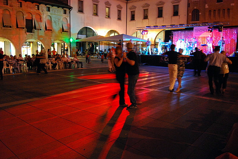 L'idea di rappresentare una manifestazione di ballo liscio pubblica è buona. Anche l'istantanea che proponi non è male. Soffre di una composizione lievemente sbilanciata a destra con l'evidente vuoto di ballerini in pista a sinistra. Sono presenti troppe sovraesposizioni sulle alte luci del complesso. Buono il taglio fotografico che crea il giusto equilibrio fra componente umana e contesto urbano. E' presente del rumore dovuto agli alti iso ma in generale la scena può andare.