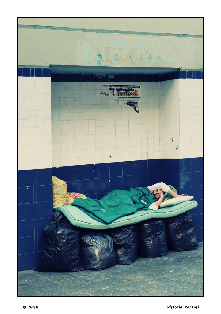 Non trovo bello pubblicare su un forum di fotografia la triste situazione di un uomo costretto a dormire su sacchi di monnezza.