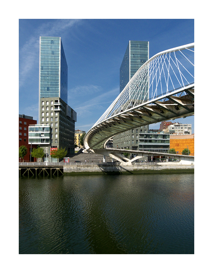 Bilbao, ponte di Calatrava (Zubi Zuri) e retrostante complesso urbanistico di Arata Isozaki