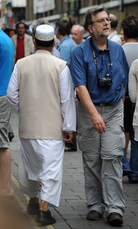 No, non è forzata... è un po' il senso che volevo dare alla foto, anche se, come spesso capita, è un senso dato a posteriori. L'intenzione originale era quella di fotografare il personaggio vestito all'orientale in mezzo alla folla, in modo che spiccasse tra gli altri.