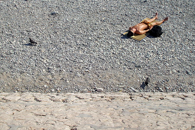 ...altro che minimalista ...questa è zeppa di elementi: muro, sassi, ominide fachireggiante e pennuti di contorno che manco degnano di uno sguardo il disteso di cui sopra....