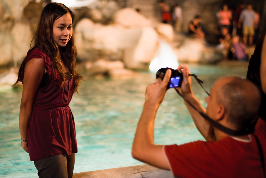 | L'ancoraggio del titolo mette in evidenza il luogo dove è avvenuta la scena: una giovane modella in posa, con un sorriso appena accennato, e un fotografo amatoriale che inquadra con la sua compatta digitale. Sullo sfondo altre figure non ben identificate. Un contenuto life debole per questo fotogramma con problemi di resa generale a causa delle condizioni di luce scarse dovute alle ore notturne. Sono presenti aree di sovraesposizione sopra la fotocamera digitale del fotografo rappresentato e sopra la nuca della sua modella. Sul bordo destro del fotogramma è presente un fastidioso contorno scuro di un'altro personaggio. |