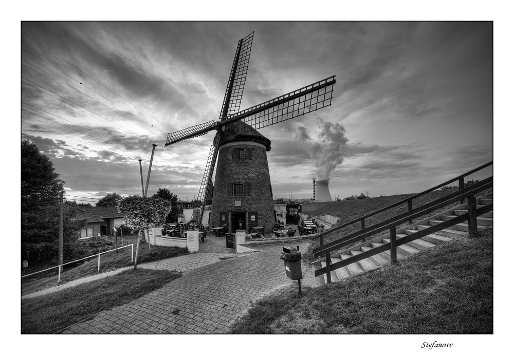 Molto interessante l'accostamento del mulino con la torre di condensazione sullo sfondo.