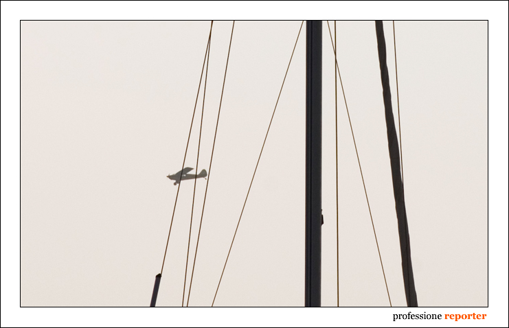 Venendo alla foto pubblicata: innanzitutto è un’istantanea, non c’è stata nessuna premeditazione né riflessione se non a posteriori. E la riflessione è stata quella a cui accenni tu: la restrutturazione della realtà, l’aereo che resta impigliato nella rete, l’associazione facile tra cielo e mare. In più lo stimolo visivo solito: la passione per le linee e tutto quanto riduce la realtà a geometria.