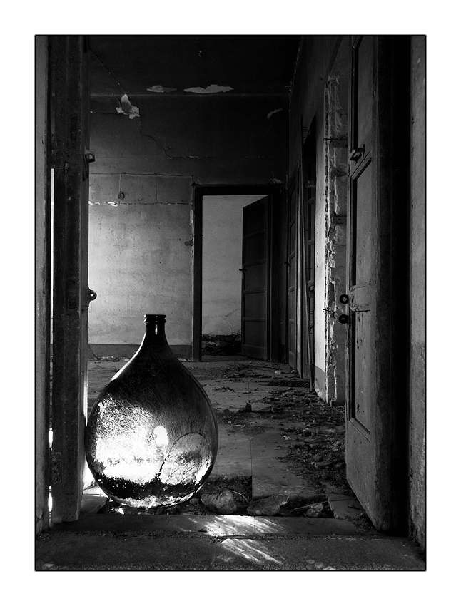 Il bianco e nero è sicuramente una scelta giusta per soggetti come questo. La foto è piuttosto valida come compromesso esposimetrico fra zona d'ombra e luce. Se ti riesce di recuperare qualche informazione visiva in più nel punto di massima luce sul vetro della damigiana spoglia il risultato diventa ancor più apprezzabile.