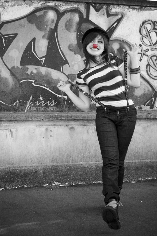 Allegra la posizione della modella e il naso da clown rosso ci sta bene.