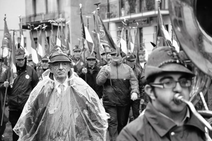 Ferma restando l' esposizione sull' alpino con l' impermeabile, evidentemente fulcro della foto, la attenuerei invece quanto basta su tutto il resto del fotogramma. Senza esagerare però.
