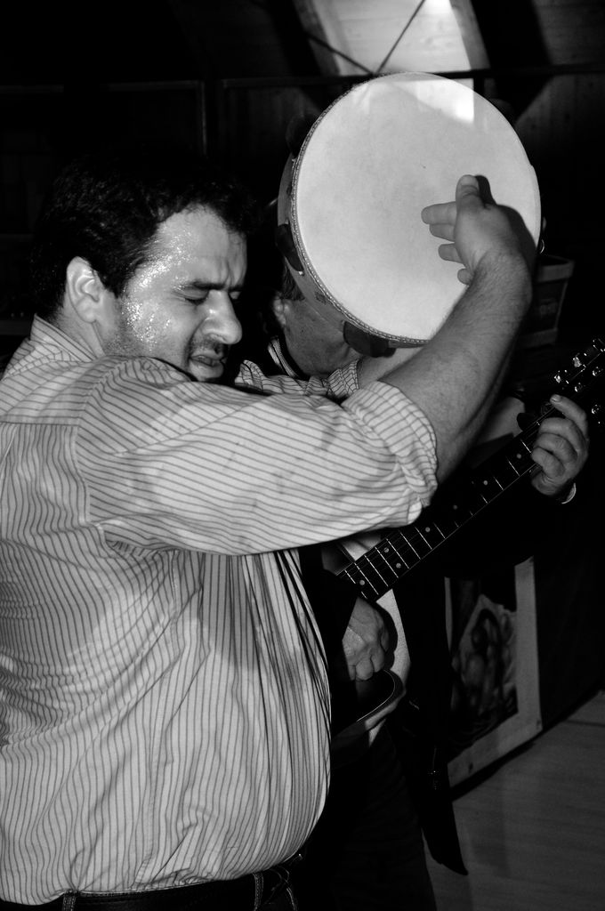 Veniamo alla foto: il flash ha sparato non poco, il sudore ha fatto il resto (sul viso), il braccio messo così non aiuta. Il tamburello sega la testa del bassista o chitarrista. Insomma una foto da rivedere oppure da usare come ricatto