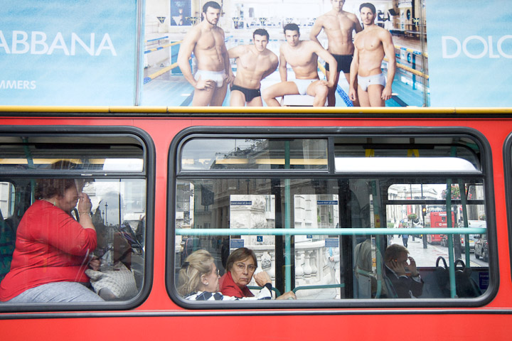 I modelli superfustacchioni, con tanto di completo intimo, che guardano le signore grassoccie nel bus.