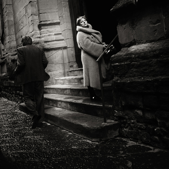 | Una fotografia che si lascia guardare volentieri nonostante l'evidente ed ingiustificata inclinazione dell'inquadratura. La tendenza percettiva a compensare la discrepanza tra lo spazio rappresentato e lo spazio di rappresentazione è notevole. Il disorientamento dell'osservatore non riesce ad avere un suo rapporto funzionale con la scena ed il taglio fotografico quadrato non sembra nativo ma piuttosto il risultato di un crop. Scena che invece persuade, ricca di atmosfera, grazie ai suoi contrasti formali e di contenuto, generati nell'inquadratura dalle due figure umane, dalle posture e dinamiche dei loro corpi e soprattutto dalla buona luce. Un'altro merito dell'autore è stato quello di cogliere un'ottimo rapporto figura/sfondo della signora in attesa sui gradini, staccando meravigliosamente il suo sguardo e proiettando l'aspettativa e la femminile curiosità fuori campo. |