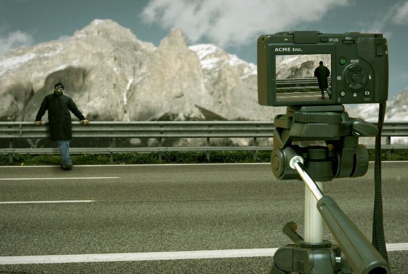 i sospetti di BiJeiTi sono più che fondati... quest'immagine è più "workata" di quello che può sembrare a prima vista... le montagne di sfondo sono in Trentino... l'asfalto e il guard-rail sono quelli dell'autostrada Piacenza-Cremona... che nessuno ha attraversato a piedi ... gli ominidi li ho fotografati in interni così come il cavalletto e la fotocamera... il tutto assemblato in PP... anche la marca "ACME" è stata aggiunta in post... è la stessa azienda che produce i congegni di Willy Coyote... e deduco dal commento lasciato che Wildrocker lo sapeva già...  |