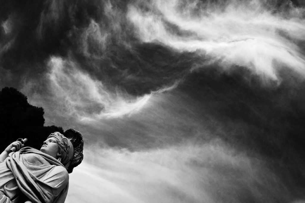 Non mi dispiace l'apocalittico cielo che sembra originare dalla statua, è pure interessante l'artificioso taglio per creare una diagonale statua/elementi naturali....
