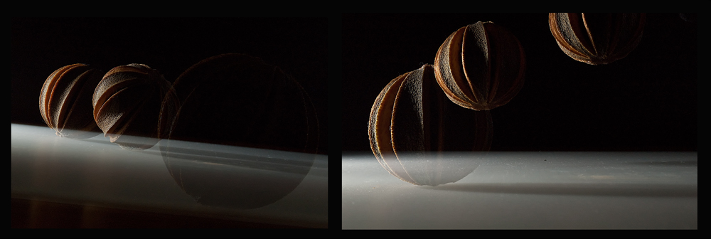 Questo e' il mio primo scatto di questo genere, credo di aver capito a cosa ti riferisci, sopratutto nel primo scatto manca luce nel primo mandarino, per quanto riguarda la base ho messo volutamente un altro colore per far sembrare che il mandarino ci cadesse dentro, a questo punto non credo esserci riuscito.