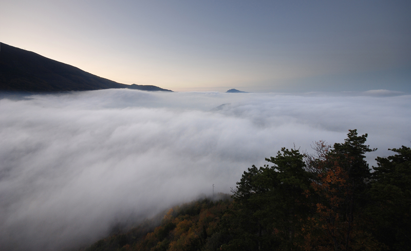 sembra un fiume in piena che si riversa nell'angolo basso della foto, questo mare di nuvole in movimento