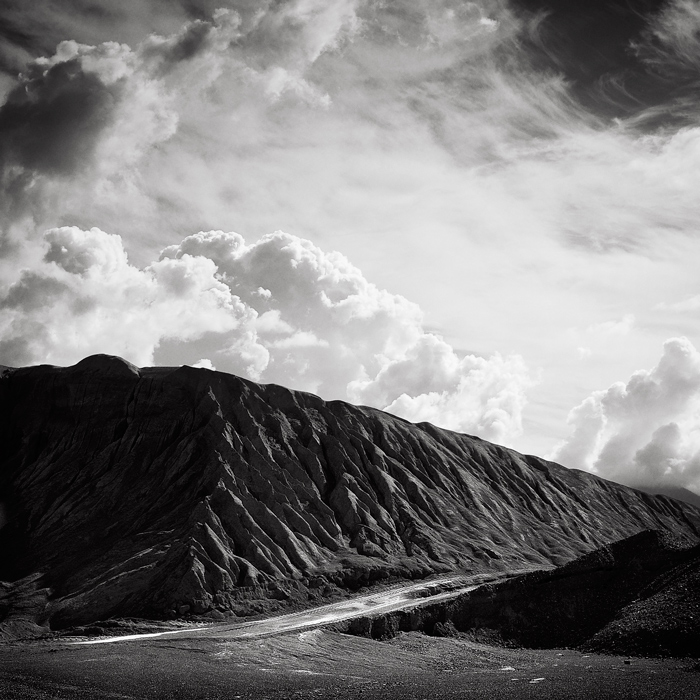 L'unico suggerimento che mi sento di darti è di eliminare dalla parte inferiore dell'inquadratura la strada, che non ha un ruolo compositivo. In questo modo ottieni tre scopi: elimini un elemento che nella semplicità di questo scatto è di troppo, dai ancora più spazio al bellissimo cielo con il suo gioco di nuvole e infine valorizzi maggiormente la montagna stessa, la cui semplice sagoma viene adesso in qualche modo "disturbata" dalla strada.