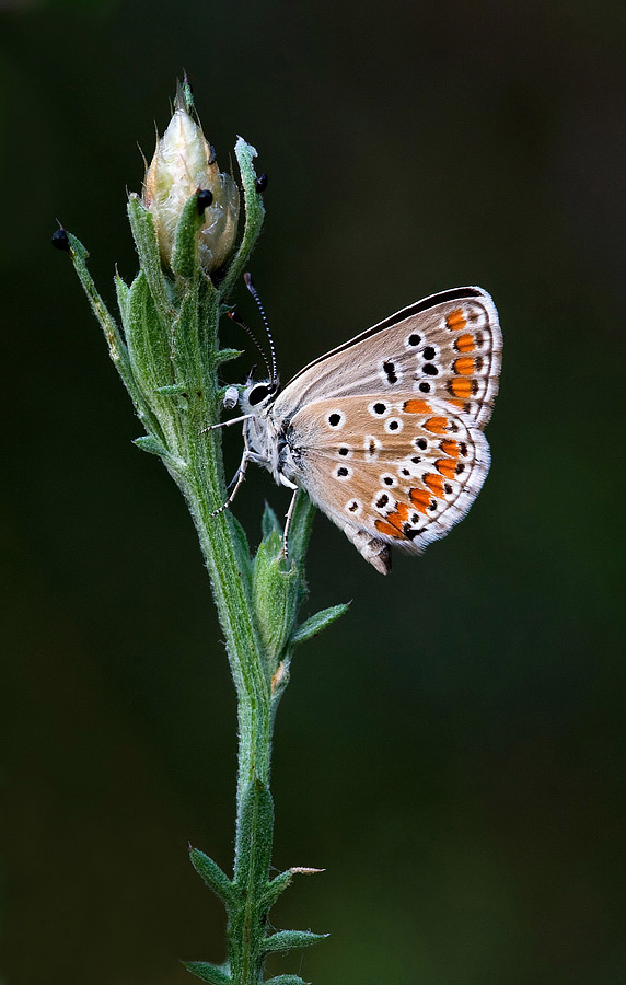 Molto bello l'accostamento tra l'arancio delle ali e lo sfondo verdone scuro.