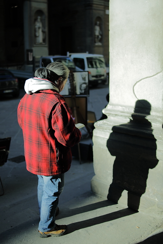 Mi fa molto piacere avere a che fare con persone umili, aperte al confronto e desiderose di imparare. La verità è che non c'è niente da imparare, a maggior ragione nella fotografia street che deve essere quanto più libera da condizionamenti e idee preconcette. Nel caso specifico la tua fotografia è banale. Riprendi da distanza ravvicinata una figura voltata di spalle per sfruttare la sua ombra riflessa sul muro. Questo tuo tentativo ben evidente, al di là che non produce un significato interessante, contrasta anche con il titolo che vuole parlare di un luogo di cultura e di storia. Molti gli elementi di disturbo in un formato verticale affogato sul soggetto in primo piano: le opere raffigurate dei comunissimi e numerosi artisti di strada, le macchine ed i furgoni parcheggiati nei piani che recedono. Oltremodo sbagliata è la scelta dell'esposizione, forse dovuta ad un diaframma troppo aperto, che ha generato una marcata sovraesposizione con il suo culmine sul cappuccio della felpa della figura voltata di spalle e dei colori alterati nei toni.
