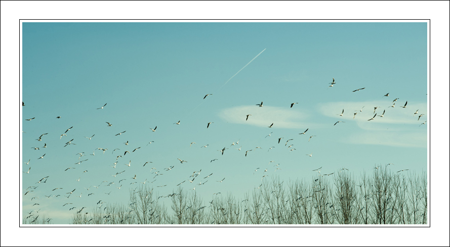 un verd-azzurro delicato, solcato dai bei segni grafici delle punte degli alberi e dal volo liberatorio dei gabbiani