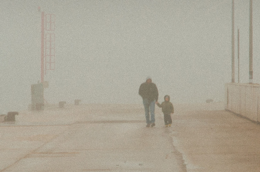 Chissà se il bambino da adulto ricorderà questa passeggiata nella nebbia con suo padre.