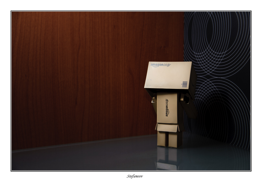 Cioè.. sinceramente non so proprio come farti capire il mio stupore. Questi scatoloni della Amazon japan.. che compongono un piccolo robot di cartone, incerto al limite fra uno sfondo di cerchi che si allargano come in un universo lontano e la facciata lignea all'altro lato ad inchiodarlo alla sua realtà.