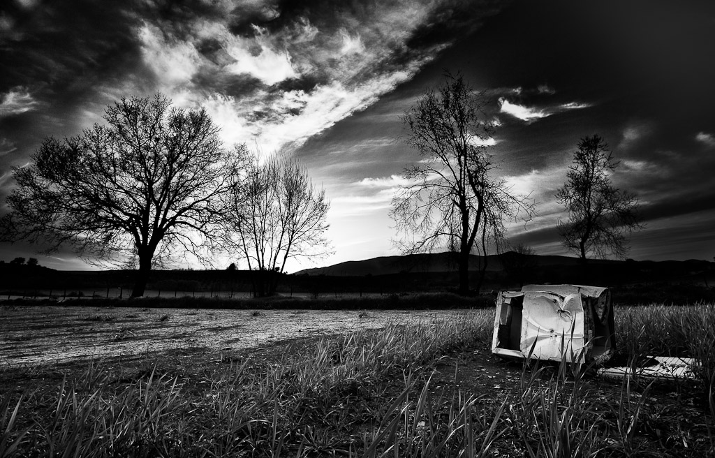 Una vecchia lavatrice giace abbandonata tra i campi incolti.