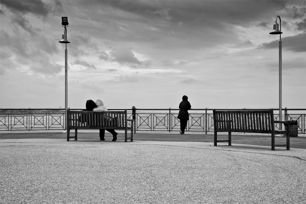 a differenza dell'altra precedentemente postata... qui vi è più spazio per controllare gli elementi in gioco e per volare di fantasia sui pensieri della persona sola che scruta l'orizzonte oppure sulla sua contrapposizione con i due sulla panchina....