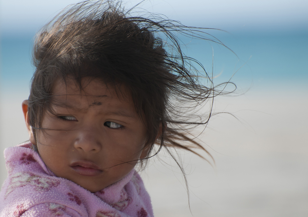 Per prima cosa felicissimo per me lo sfondo nella sua resa: cremoso e morbido, indistinto, eppure lascia trasparire la sembianza di un fondale di sabbia e azzurro. La location esterna si lascia poi intuire per il vento che sconvolge carezzevole ma deciso i sottilissimi capelli della piccola. Lei è un po' imbronciata e lo sguardo sfugge di lato in modo forse un po' brusco. Il cipiglio è ombroso , come dopo un capriccio, e la oscurità con cui lo hai ripreso, accentua il mood. Io avrei cercato, anche per aumentare la tridimensionalità del ritratto, un pur debole flash di riempimento, oppure, in post, avrei sumulato un pannello argenteo, con un filtro. Avresti dato maggior risalto al viso, senza esagerare , nè sconvolgere la scena.