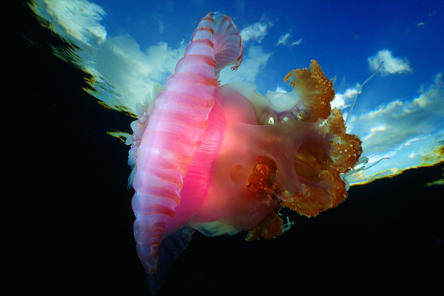 Fotografia subacquea, la medusa è stata ripresa da sotto, la profondità era minima, quello che si vede nella parte superiore della foto è il cielo, mentre la parte scura è il rift.