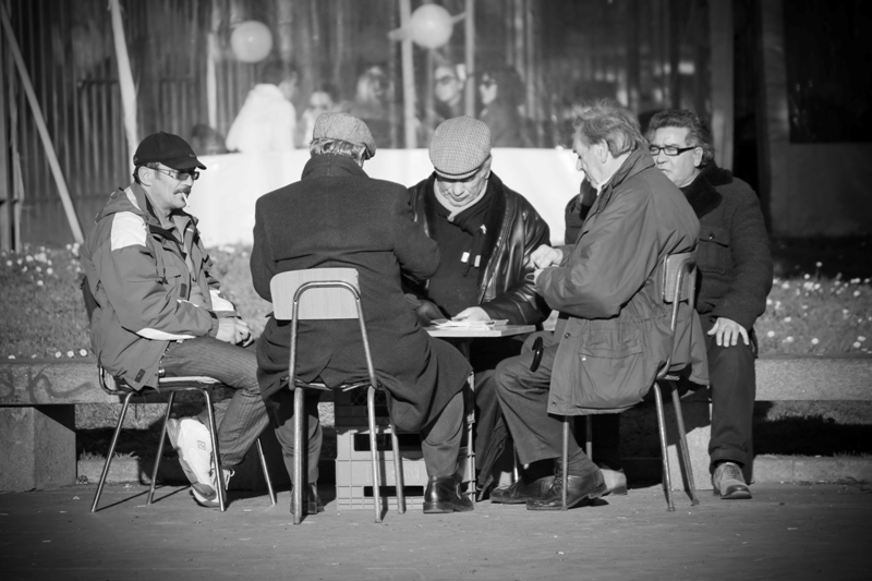 come probabilmente ti diranno le persone che commenteranno dopo di me, il messaggio di una foto di questo genere dovrebbe essere maggiormente indipendente dal titolo associato. Il gioco a carte in piazza è sempre cmq un soggetto molto usato, ma legato magari a inquadrature più strette.... Obiettivamente la scena ritratta è un po' povera di valore street.... .