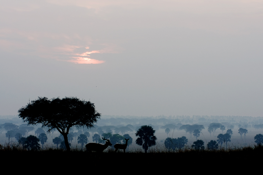 Mi piacciono queste silohuette miste di mondo animale e vegetale, che man mano si disperdono all'orizzonte, su delle tonalità blu.