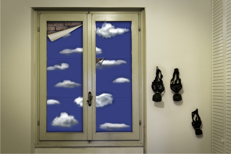 Una foto bellissima e molto intelligente; vorrei lodare in particolare la grande pulizia della composizione e il gioco intelligente della sovrapposizione degli adesivi sulla finetsra. Il doppio strappo del folgio con le nuvole - quello più grande a sinistra e quello più piccolo che gli afa da eco a destra è davvero una chicca elegantissima.