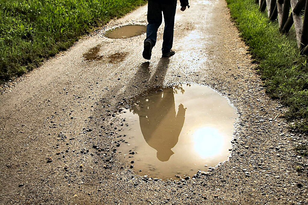 Il riflesso del sole nella pozzanghera, che sembra guidare l'omino nel suo camminare, sottolinea ancor di più, la riuscita narrativa della scena.