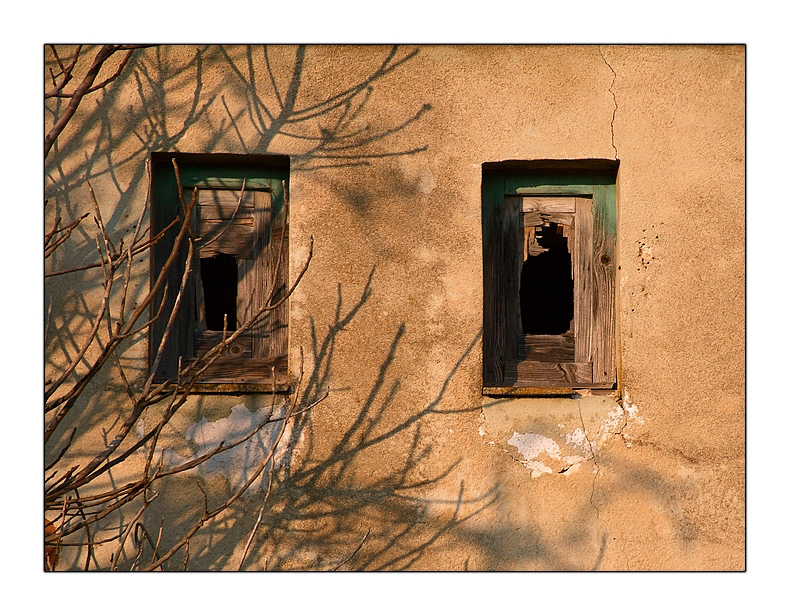 Luci calde ed ombre leggere ad accarezzare come ciglia questi due occhioni ricavati in finestre oramai rovinate dal tempo e dall'abbandono...