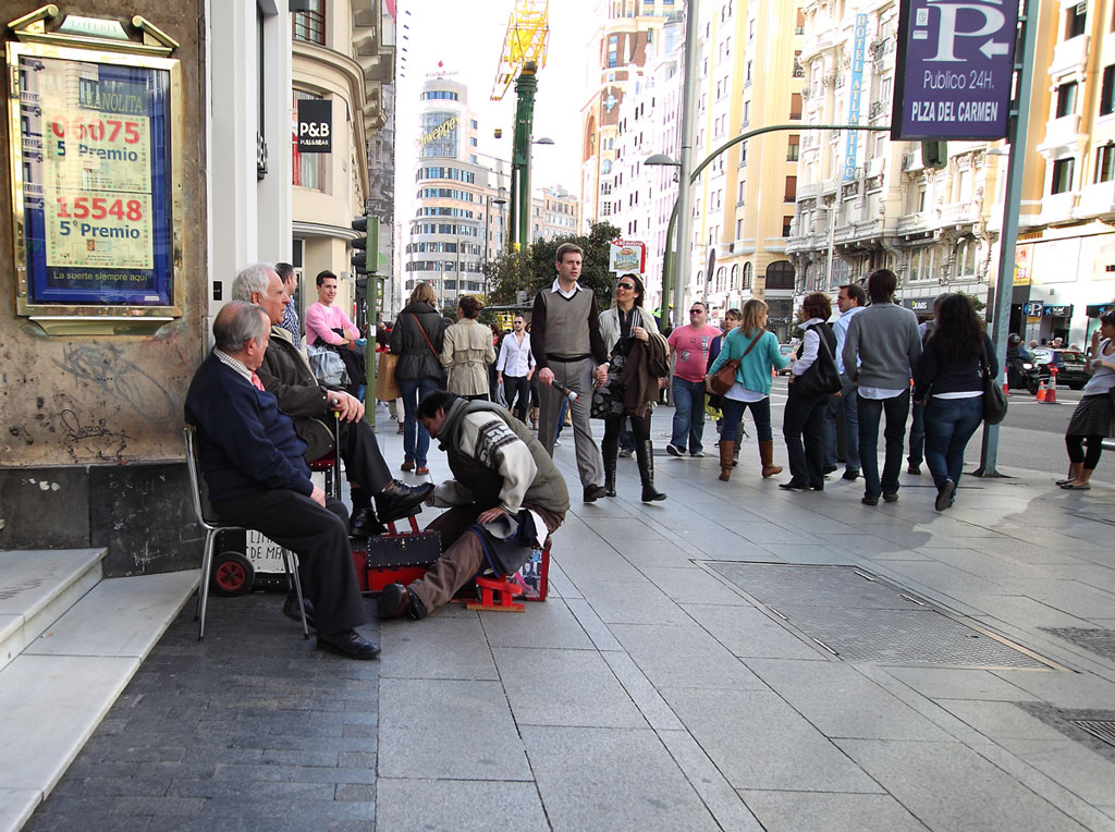 mi sarei dedicato alla metà del fotogramma sulla sinistra spostandomi verso destra per inquadrare meglio il lustrascarpe e la sua attrezzatura, avendone la possibilità non avrei utilizzato il grandangolo che ha deformato un po' l'immagine,