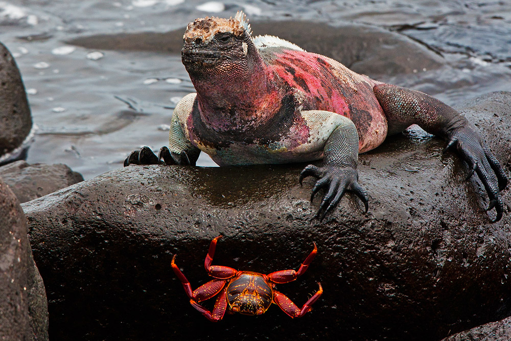 Fantastici i colori di questa strana coppia. L'iguana marina senza dubbio ha esagerato con la tintarella e forse anche tu un pochino con la saturazione. Avrei tenuto anche io l'inquadratura + a destra riducendo l'impatto dei massi in primo piano e lasciando maggior respiro alla zampa destra