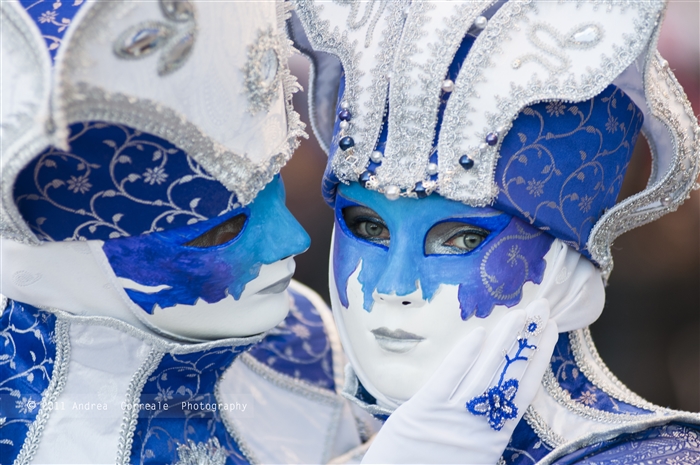 ....molto bello questo sguardo azzurro immerso nella tavolozza di bianchi e cobalto, diretto in camera a sciogliere per un istante la muta fissità delle maschere.