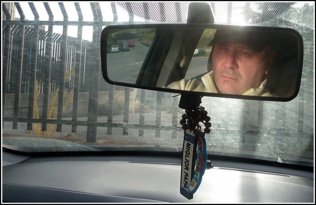 Guardo gli occhi ma poi vengo attratto dalla forte luce sopra e sotto lo specchietto e allora mi si sposta automaticamente a guardare le auto parcheggiate a sinistra dello specchietto retrovisore. Poi riguardo il viso, ci leggo poco e lo sguardo si risposta sulla cancellata...e così via...