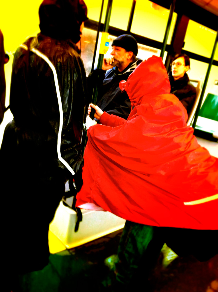 la mantellina antipioggia evidenzia a dismisura, quasi grottesco, il peso che il ragazzo deve trasportare per andare a scuola...