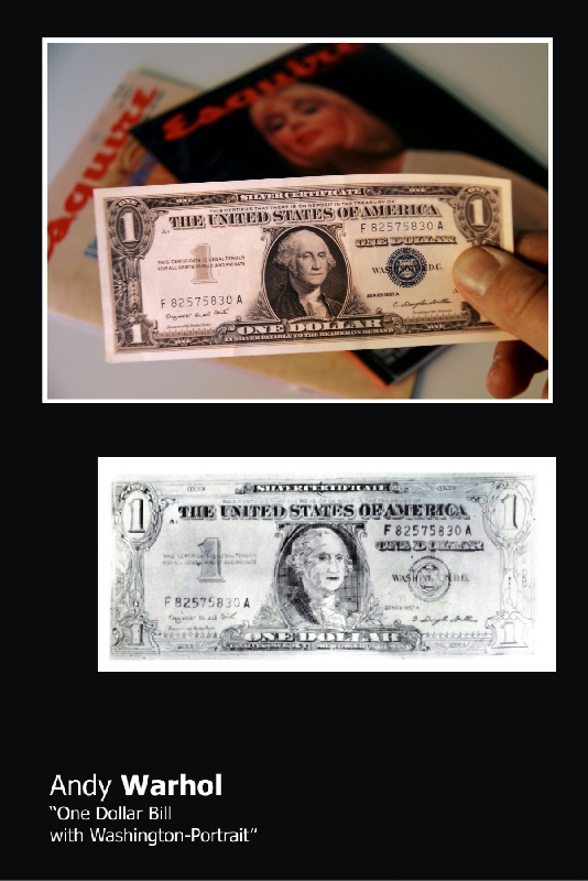 Proprio mentre sfogliando i giornali, si ha modo di leggere che la banconota commerciale da un dollaro, oggetto di discutibili simbolismi esoterici (di cui ne è pieno il web), sarà presto sostituita da una moneta di pari valore (poichè risulta troppo cara per l'economia degli USA per via della tristemente famosa crisi economica), e ricordando a grandi linee la quotazione stimata dell'opera del Grande Maestro Andy Warhol, con piacere, si riassapora questa certosina riproduzione, quasi da falsario direi (passami la battuta ).