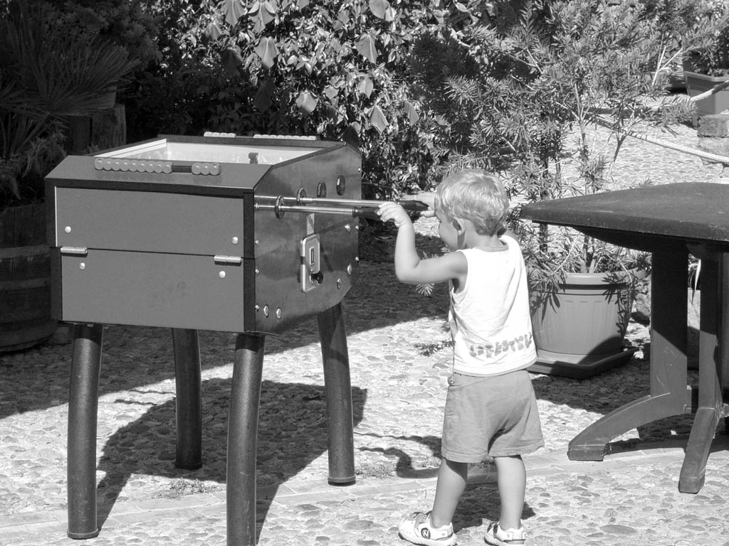 Tecnicamente rivedrei alcuni importanti aspetti : in primo luogo, il b/n per uno scatto del genere ci sta molto bene, secondo me, ma avrei scelto assolutamente un momento della giornata con luce molto meno dura. LA composizione della scena è giusta, mi piace molto il fondo vegetale, ma avrei cercato di eliminare qualche elemento che poco interessa ai fini del messaggio (Es. tavolino di plastica sulla destra). Occhio anche ai piedi tagliati (sia del bimbo, che del calcetto).
