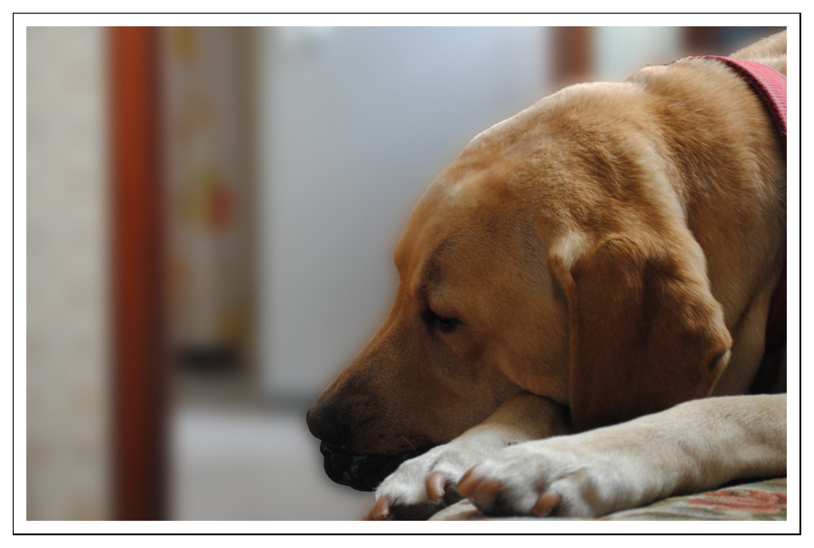 molto simpatico il soggetto e il momento colto senza lo sguardo in camera, ma mi lascia un po' perplesso quell'alone intorno al muso... sfocatura in post o difetto del mio monitor?