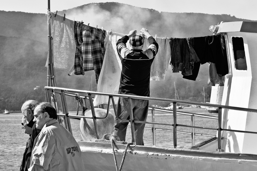Ti esprimo una mia perplessità, partendo dal presupposto che trovo curioso e simpatico l' omino che stende la biancheria sulla barca e perciò meritevole di attenzione. Tuttavia trovo che la situazione, così come l’ hai proposta (inquadratura stretta sul soggetto) abbia senso compiuto già in sé stessa. Sicché, pure se comunque contribuiscono ad animare e contestualizzare in parte la scena, le figure di passaggio mi paiono superflue e, direi, quasi sconvenienti perché non si relazionano con il soggetto se non nel rappresentare una certa indifferenza. Come dire che da un lato si suggerire di cogliere qualcosa di inusuale e divertente e dall’ altro, anziché introdurre un elemento che sottolinei questo, se ne introduce uno che suggerisce, in qualche modo, il contrario. Probabilmente, se la scena fosse stata più ampia, così da attribuire un diverso ruolo ai passanti, mi avrebbe fatto un effetto diverso. In sintesi, guardo l’ omino, più che altro, perché se guardo tutto mi pare meno efficace. IMHO naturalmente.