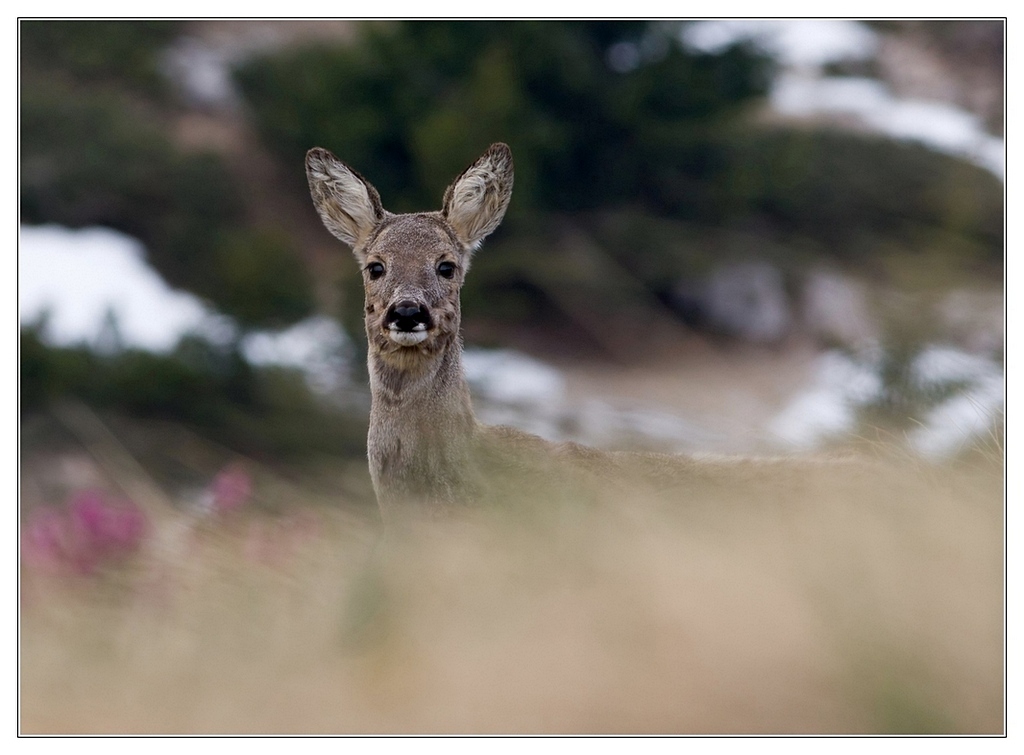 Mentre tra i mughi mi godevo le risse dei galli forcelli mi è spuntata all'improvviso una femmina di capriolo...il cielo era coperto e la luce era poca, ho estratto dallo zaino la reflex ed ho scattato senza prendermi il tempo di cambiare impostazioni.