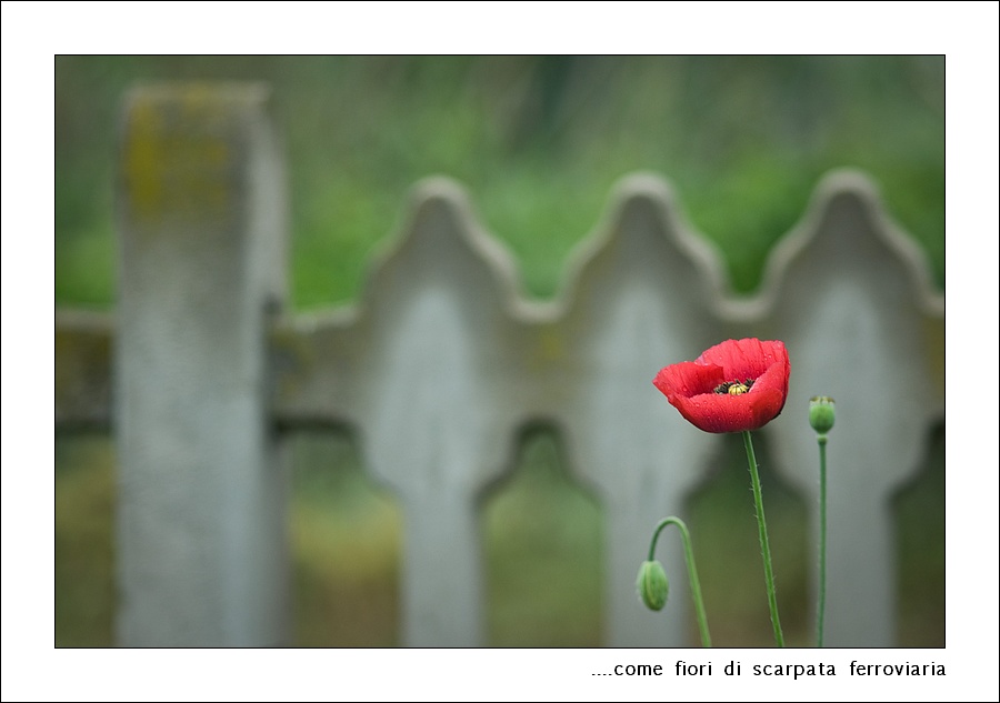 La posizione del soggetto che si erge solitario contro un'inferriata e le tonalità sobrie la rendono poetica e diversa dalle solite foto di papaveri. Ciao
