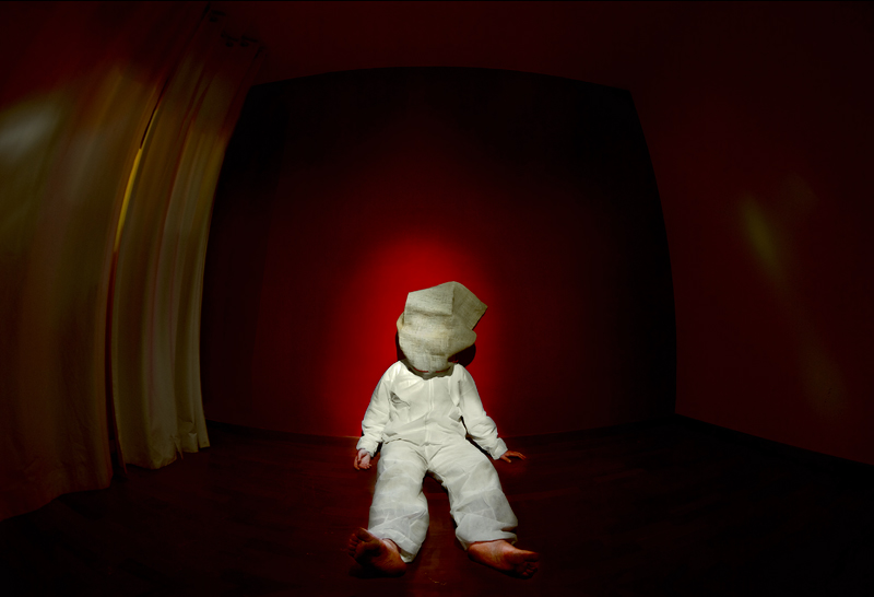 Una scena coreografata con molta semplicità e con altrettanta efficace coerenza. La drammatizzazione gioca sull’ ambigua identità del soggetto che nelle percezione oscilla tra l’ essere umano (*) e la bambola. Magistrale la sinergia: l’ accurata posa propone la bambola; il volto coperto (alla maniera dei crudi video ai tempi dell’ Irak – per me) suggerisce l’ essere umano costretto. L’insieme lascia indefinito il personaggio rappresentato e quindi la storia cui allude questo tableu perché possano entrambe prendere forma nella mente, nei pensieri di ciascuno.