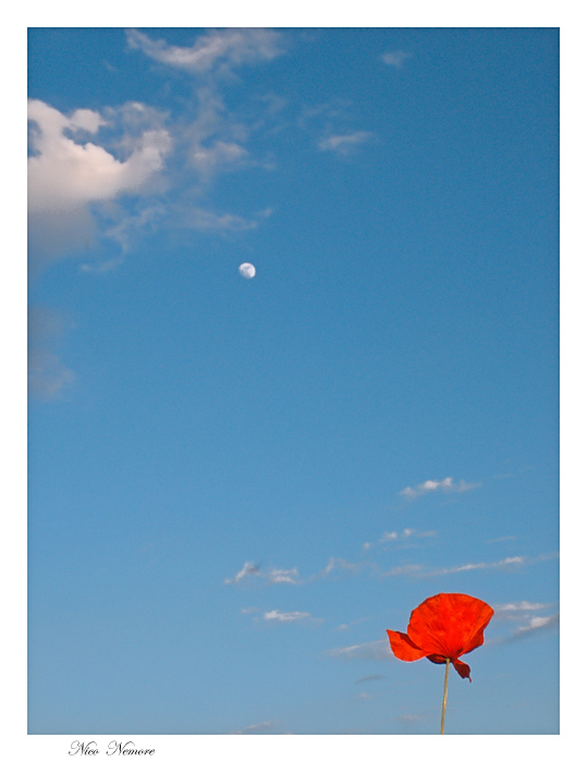 Smile quanto mi piace questa nico... minimalismo non solo compositivo, ma anche cromatico. e poi la luna a far da contraltare al protagonista. bella foto, complimenti.