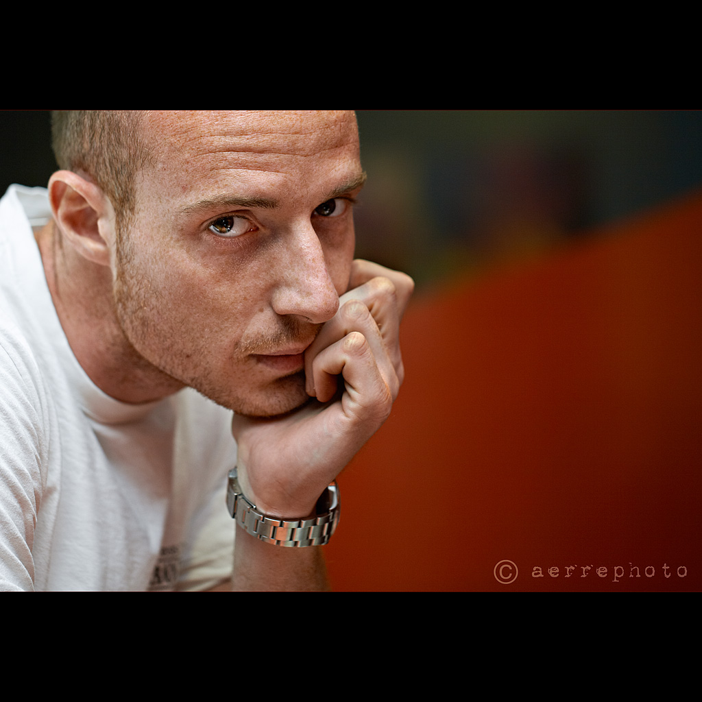 @ longaf: grazie per aver notato lo sfondo!! Very Happy ....non si nota subito ma quel bordo arancione (che è il desk sul quale si appoggia Vinenzo) in direzione diagonale ribadisce la linea degli occhi. Tutto il fotogramma è costruito su quella quasi diagonale. Oltre al flash di rimbalzo ci sono i faretti alogeni (spot) proprio sopra la testa a circa 3.5 m di altezza.