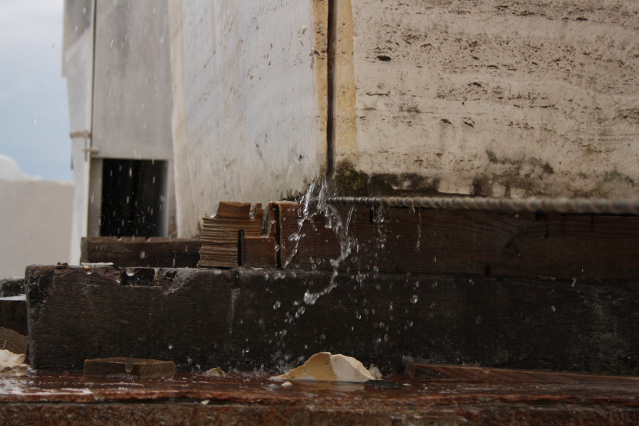 Penso sia un particolare del taglio di una lastra di un blocco di marmo e del raffreddamento ad acqua del disco o punta diamantati...(se così non fosse correggimi...)