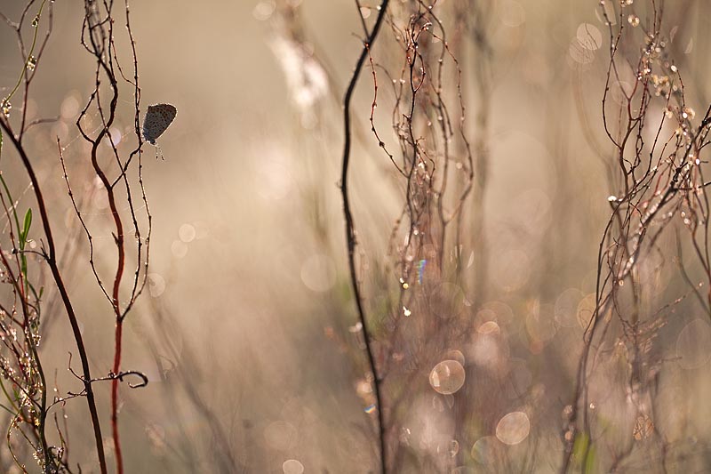 Le tue visioni un po' anticonformiste, che vedono attraverso le piccole cose dei grandi teoremi: gocce di filosofia in chiave macro. La farfallina, piccola, mimetizzata nel tuo drappo quasi monocromatico di colore, vive nel controluce di un ambiente frastagliato di steli contorti, come in un bosco stregato, dove solo il sollievo di luce filtratta e di globi umidi di pioggia, danno speranza e parlano della vita. Una delle tue più belle.