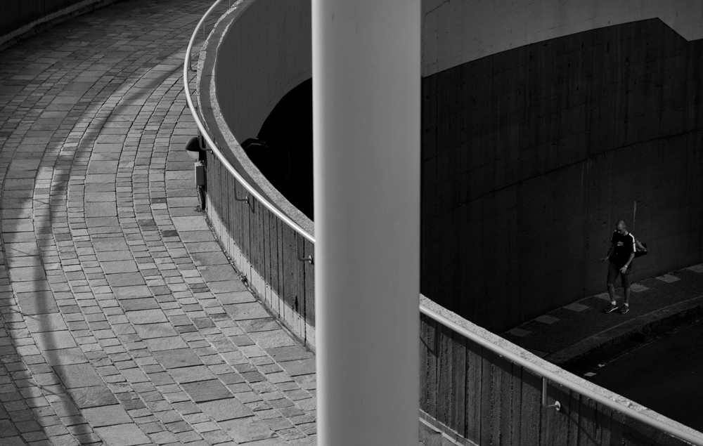 Bella inquadratura, ottimo bianco e nero, bel bilanciamento dei toni chiari, a sinistra e di quelli scuri, a destra, dove emerge l'uomo